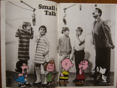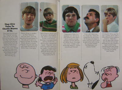 'Tis the season for the classic Peanuts TV specials so here, thanks to TV Guide, is a look at the kids (along with Peanuts animation director Bill Melendez as the"voice" of Snoopy) who performed the voices for He's Your Dog, Charlie Brown (1968). Included are Peter Robbins and Chris Shea are the original voices of their respective characters, having originated the vocal roles even before A Charlie Brown Christmas in the Ford commercials of the early 1960s. I like the way TV Guide had the actors mimic the facial expressions and physical attitudes of the animated characters. (Peter Robbins expression in the color photo is especially good—you can really see, as Andy Griffith might say, the actor in the man, er, boy.) The talents of these young actors are one reason the special as featuring their voices are so outstanding—they weren't simply kids cast to get a certain sound, Peter and Chris were actually actors with true performing skill. Just think of Linus proclaiming the Gospel's Nativity story or Charlie Brown saying, "I got a rock,"and you'll see—and hear—why their original vocalizations remain the gold standard.